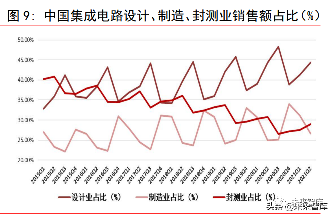 我國集成電路三大環節共同發展,專業化分工趨勢明顯。根據中國半導體行業協會數據, 2021 年上半年我國集成電路累計實現銷售額 4,102.9 億元,同比增長 15.93%。從各產 業鏈環節看,2021 年上半年我國集成電路設計、製造和封測環節銷售額分別為 1,766.40 億元、1,171.80 億元和 1,164.70 億元,佔集成電路總銷售額比重分別為 43.05%、28.56% 和 28.39%。從國內集成電路結構來看,我國集成電路設計、製造和封測三個環節齊頭並 進發展,專業化分工趨勢明顯。