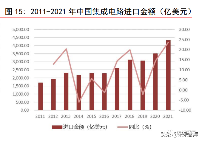 國內集成電路國產替代速度加快。根據國家統計局的數據,我國集成電路總生產量從 2011 年的 761.80 億塊增長至 2021 年的 3,594.30 億塊,2011-2021 年的複合增長率為 16.78%。作為對照,國內集成電路進口金額從 2011 年的 1,701.99 億美元增長至 2021 年 的 4,325.54 億美元,2011-2022 年的複合增長率為 4.42%。由此可見,近十年我國集成電路生產速度快於集成電路進口增長速度,表明我國集成電路行業國產替代速度加快,集 成電路生產量不斷提高,已部分實現國產替代。
