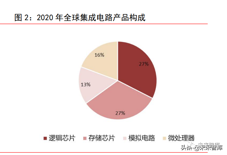 集成電路是半導體制造業的核心,佔半導體行業規模八成以上。從產業鏈角度劃分,半 導體產業鏈可分為上游半導體設備及材料產業、中游半導體制造產業和下游應用產業, 其中中游的半導體制造產業按照產品分類可分為光學光電子、傳感器、分立器件和集成 電路四大類,而集成電路又可分為邏輯芯片、存儲芯片、模擬電路和微處理器四類。從 市場規模佔比來看,集成電路是半導體制造業的核心,佔半導體行業規模的八成以上。
