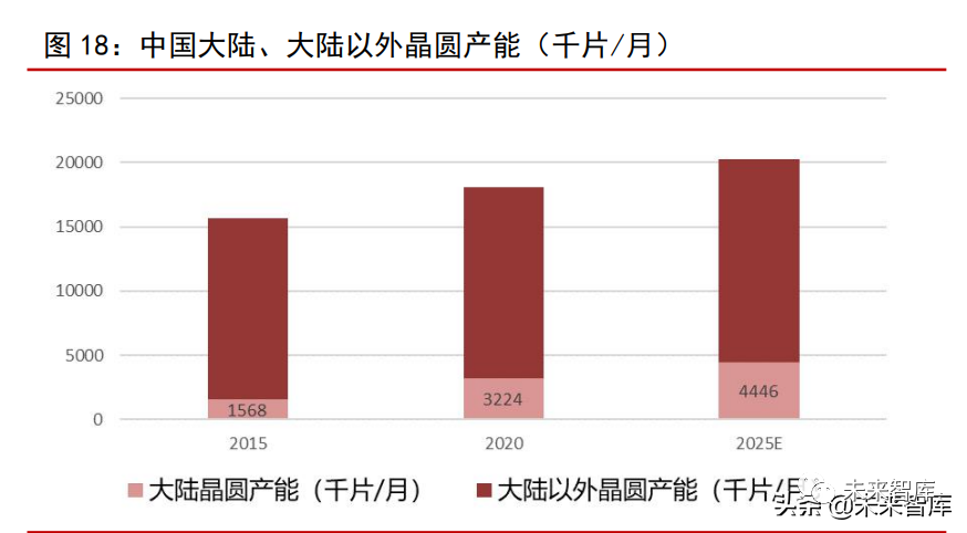根據 SEMI 數據,美國集成電路製造業產能已從 1980 年的 42%,跌至 2020 年的 12.8%, 而我國大陸地區晶圓產能已從 2011 年的 9%,提升至 2020 年的 18%。根據 SEMI 預測, 2018-2025 年中國大陸地區的晶圓產能佔全球的比例將從 18%提高至 22%,年複合增長 率約為 7%。隨着全球集成電路製造業逐漸向大陸地區轉移,集成電路封測業作為晶圓 製造產業鏈的下游環節,將充分受益於全球晶圓產能轉移帶來的封測市場需求傳導。