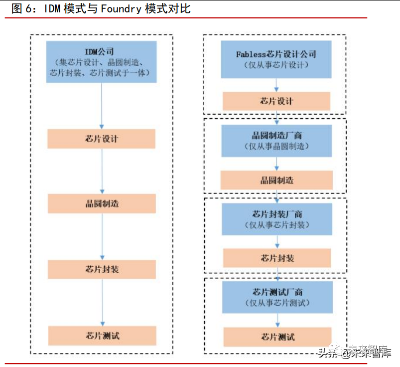 傳統 IDM 模式壓力日益加大,集成電路專業化分工成為發展方向。一般來説,垂直整合 製造(IDM)模式下的集成電路企業不僅包括集成電路設計部門、晶圓製造廠,還包括 下游的封裝測試廠,屬於重資產經營模式,對企業的研發能力、資金實力和技術水平都 具有較高要求,在晶圓製程和封裝技術方面難以保持先進性;而 Foundry 模式則源於產 業鏈的專業化分工,從上游到下游形成無晶圓廠設計公司(Fabless 企業)、晶圓代工 企業和封裝測試企業。