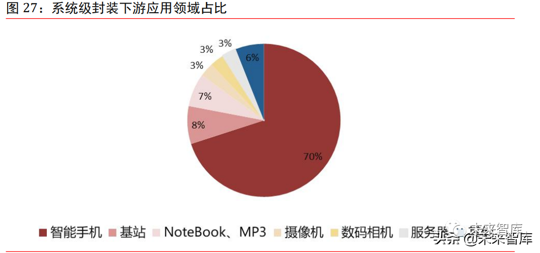 以系統級封裝為例,現階段,以智能手機為代表的移動消費電子領域是系統級封裝最大 的下游應用市場,佔了系統級封裝下游應用的 70%。根據 Yole 預測,未來 5 年,系統級 封裝增長最快的應用市場將是可穿戴設備、Wi-Fi 路由器、IoT 物聯網設施以及電信基礎 設施。尤其隨着 5G 通訊的推廣和普及,5G 基站對倒裝球柵陣列(FC-BGA)系統級封裝 芯片的需求將大幅上升,未來 5 年基站類系統級芯片市場規模年均複合增長率預計高達 41%。