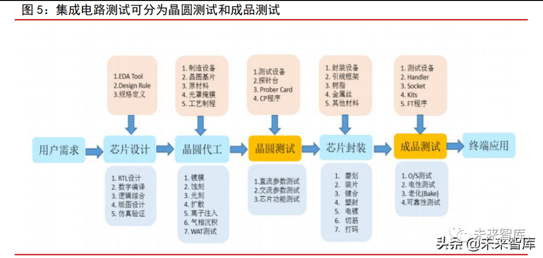 與傳統 IDM 模式相比,分工細化的模式使得成本更加節約,資源更加專注,有效降低了 行業的投資門檻,是近年來集成電路產業最重要的模式變化。爲了應對激烈的市場競爭, 大型半導體 IDM 公司逐步將封裝測試環節剝離交由專業的封測公司處理,封測行業變成 集成電路行業中一個獨立子行業。在集成電路行業專業化、分工化的發展趨勢下,將有 更多的晶圓製造和集成電路封測訂單從傳統 IDM 廠商流出,對下游封測企業構成利好。隨着上游高附加值的芯片設計行業加快發展,也更有利於推進處於產業鏈下游的集成電 路測試行業的發展。(報告來源:未來智庫)
