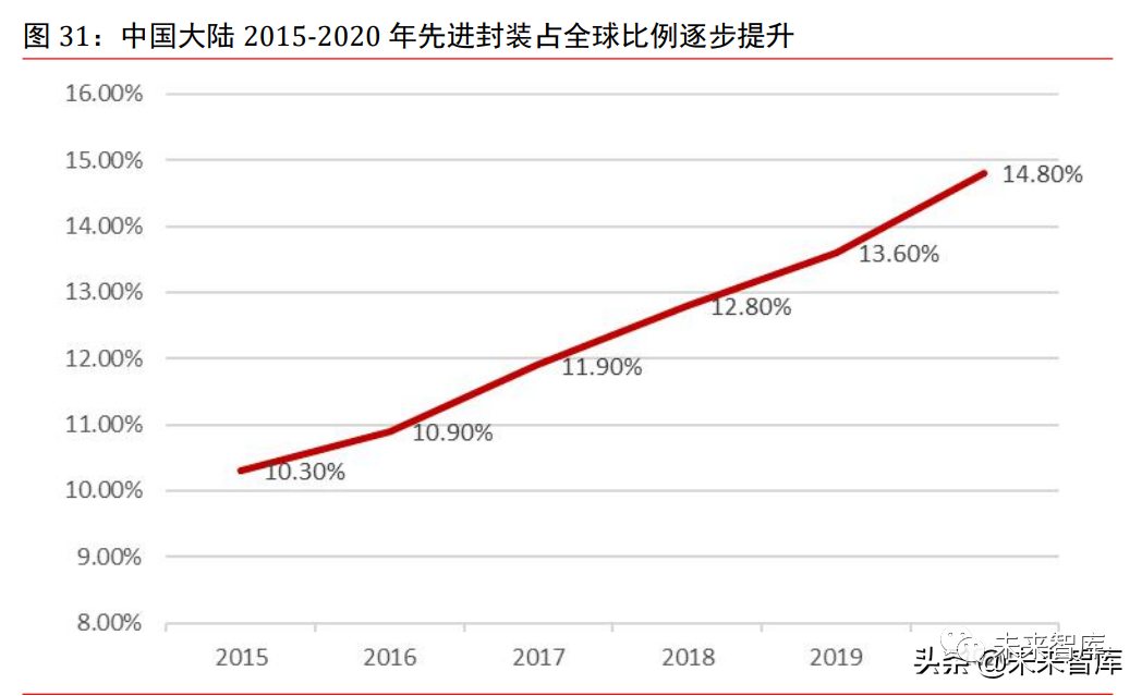 我國先進封裝產值佔全球比重穩步提升,未來有望繼續提高。與集成電路其他環節相比, 我國集成電路封測業起步較早且發展較快,但仍以傳統封裝產品為主,先進封裝產值佔 比較低。近年來,國內廠商通過兼併收購,快速積累先進封裝技術,目前封測廠商技術 平臺基本做到與海外同步,大陸先進封裝產值佔全球比例也在逐漸提升,從 2015 年的 10.3%提升至 2020 年的 14.8%。作為全球最大的半導體消費國,在「下游需求高景氣度+ 集成電路高端領域國產替代加速」的雙輪驅動下,我國先進封裝產值佔全球比重有望進 一步提高。