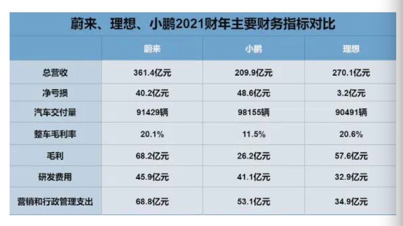 其一是營收最少,2021年小鵬實現營收210億元,只有蔚來的58%。其二是虧損最大,2021年小鵬淨虧損約48.6億元,高於蔚來的40.2億元,更遠超理想多3.2億元。其三是毛利/率最低,其中毛利26.2億,相當於理想的45%、蔚來的38%。