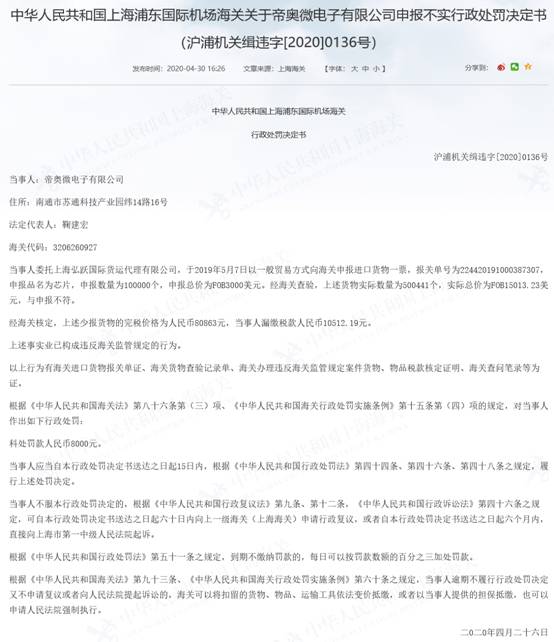 根據行政處罰決定書,帝奧微委託上海弘躍國際貨運代理有限公司,於2019年5月7日以一般貿易方式向海關申報進口貨物一票,報關單號為224420191000387307,申報品名為芯片,申報數量為100000個,申報總價為FOB3000美元。經海關查驗,上述貨物實際數量為500441個,實際總價為FOB15013.23美元,與申報不符。