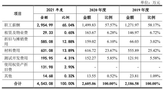 其中,職工薪酬分別為1,189.68萬元、1,271.97萬元、1,499.83萬元、2,954.99萬元,佔比分別為47.35%、58.17%、57.57%、65.04%。