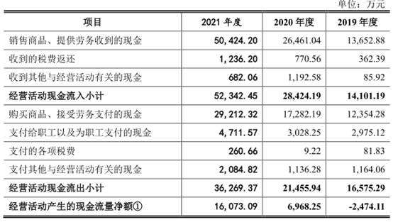 報告期內,公司經營活動產生的現金流量淨額分別為-2,852.11萬元、-2,474.11萬元、6,968.25萬元、16,073.09萬元,銷售商品、提供勞務收到的現金分別為10,242.37萬元、13,652.88萬元、26,461.04萬元、50,424.20萬元。