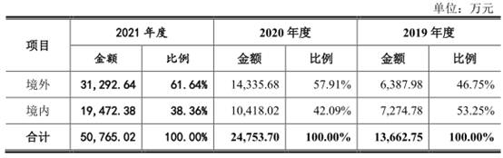 2018年至2021年,帝奧微境外銷售收入分別為5,133.77萬元、6,387.98萬元、14,335.68萬元和31,292.64萬元,佔公司當期主營業務收入的比例分別為52.72%、46.75%、57.91%和61.64%。