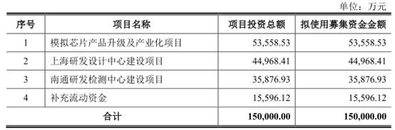 公司擬募集資金150,000.00萬元,其中53,558.53萬元用於模擬芯片產品升級及產業化項目、44,968.41萬元用於上海研發設計中心建設項目、35,876.93萬元用於南通研發檢測中心建設項目、15,596.12萬元用於補充流動資金。
