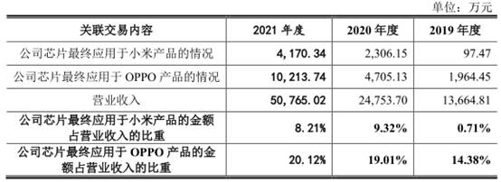 2021年,公司芯片最終應用於小米和OPPO產品的金額合計佔公司營業收入的28.33%。