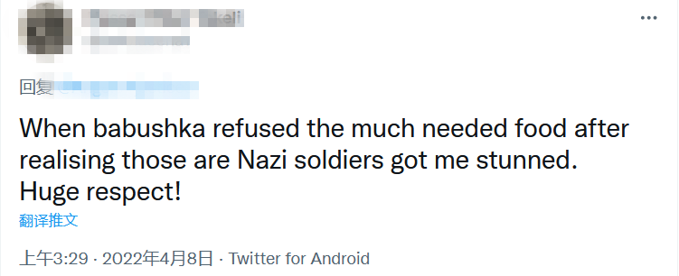 「當包着頭巾的老奶奶意識到那些是納粹士兵后拒絕了急需的食物時,我驚呆了。向她致以崇高的敬意!」