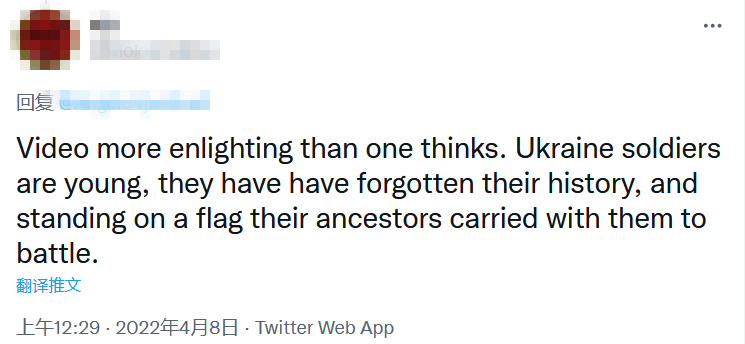儘管沒有英文媒體報道這則新聞,但視頻卻已經「出圈」,在英文世界里也引起了很大的轟動,許多人不敢相信畫面中發生的一幕。「這些年輕的烏克蘭士兵已經忘記了自己的歷史,(竟然)踩在他們祖先的旗幟上。」
