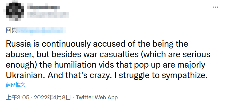 也有一些自稱本是支持烏克蘭一方的網友,看到烏克蘭士兵如此對待自己的人民時不禁也動搖了,「俄羅斯不斷被指責為施虐者,但也只是戰爭傷亡(相當嚴重)而已。可為什麼網上熱傳的羞辱視頻絕大部分都是烏克蘭做的,這太瘋狂了。」