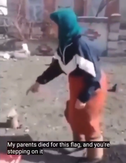 隨后,老奶奶以一種隱忍的語氣痛斥士兵:「當初我的父母爲了守護這面紅旗犧牲了性命,而如今你卻將它踩在腳下!」