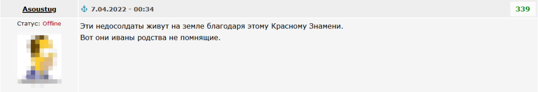 有網友激動地寫下一大段話,「一個有點駝背的小老太太,她一生守着家里這面神聖的紅旗,因為這代表着她的父母曾用血肉之軀戰勝了人類歷史上最大的邪惡。就算那個混蛋一腳踩在了2700萬名蘇聯英雄為之付出熱血的象徵上,她也不害怕,也沒有用這面旗去換食物。這個拿着紅旗的奶奶就是我們所有人,我們的歷史,我們的共同記憶,我們數百萬的先輩,我們的民族血液,我們的真理!」