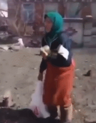 沉默地看着士兵踩踏紅旗許久,終於緩過神的老奶奶把食品重新裝回袋子,放在了士兵的腳邊。