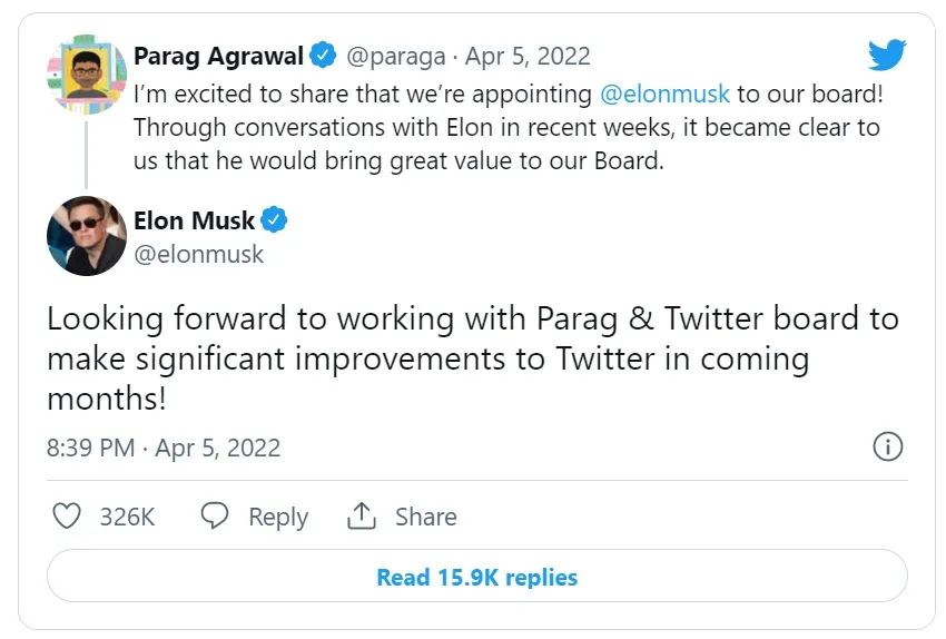 隨着特斯拉CEO馬斯克購入推特9.2%的股份,併成為最大股東后,CEO Parag Agrawal發推祝賀:「我很高興與大家分享,我們正任命埃隆·馬斯克加入我們的董事會! 通過最近幾周與埃隆的交談,我們清楚地看到,他將為我們的董事會帶來巨大的價值。」 馬斯克回覆,表示他期待與Parag和推特董事會合作,在未來的幾個月內對推特進行重大改進。