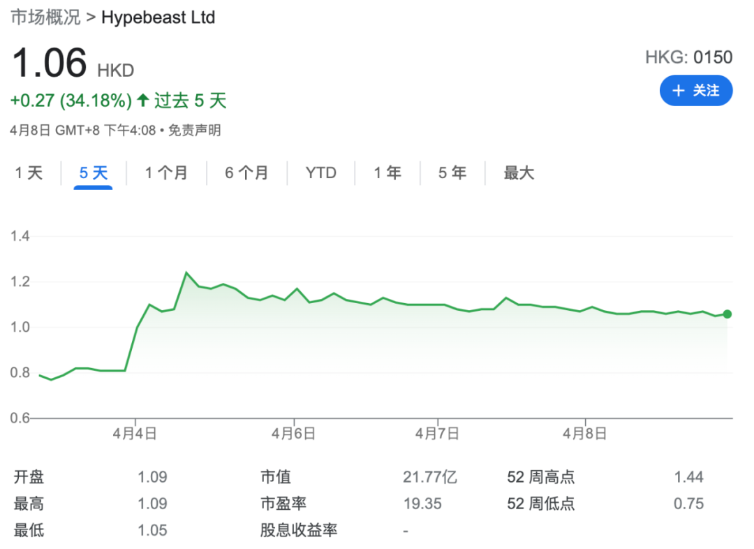Hypebeast股價過去5天上漲34.18%