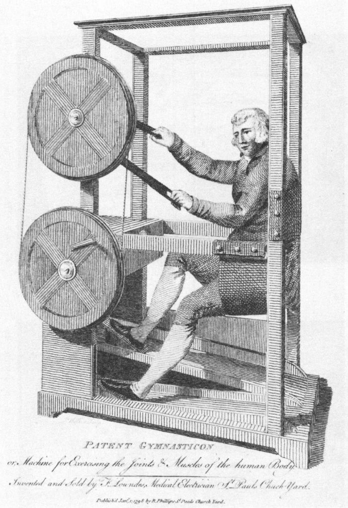 一種名為Gymnasticon的器械,於1741年被發明。這種由腳踏板、手搖曲柄、飛輪組成的器械一度被應用於輔助治療肌肉萎縮、麻痺、關節風濕等症狀,甚至直接影響了19世紀后物理治療的發展。