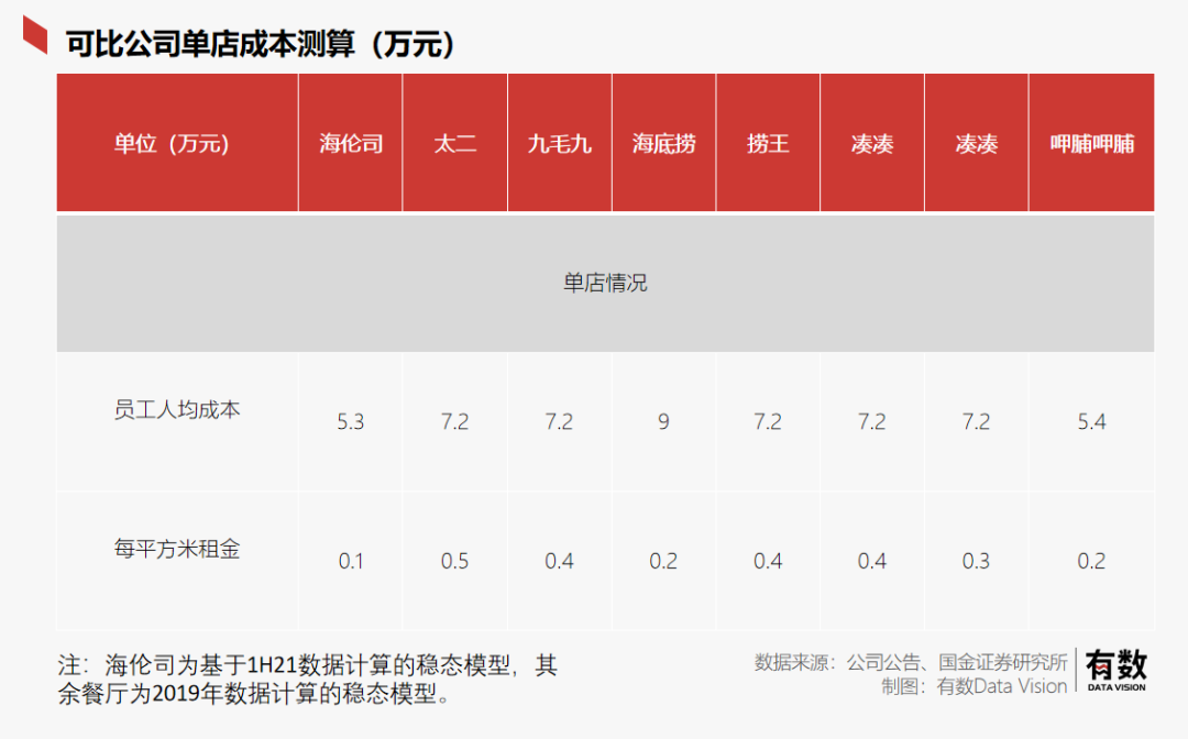先説員工成本,根據國金證券的測算,海倫司的員工平均成本僅為5.3萬元,遠低於各大連鎖餐飲,如太二、撈王、湊湊人均成本在7.2萬元附近,海底撈更是高達9萬元。
