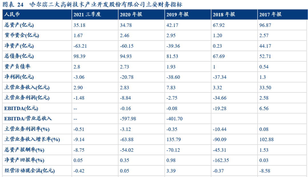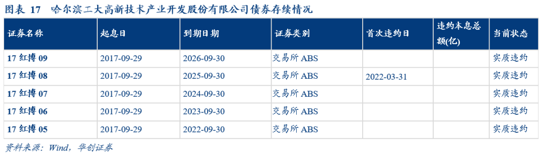 哈爾濱工大高新技術產業開發股份有限公司:系哈工大集團實控的上市公司,2015年以前以物業租賃為主要收入來源,2014-2015兩年持續虧損,財務基礎較為薄弱,2015年收購漢柏科技后因其處於發展階段,大量預付賬款導致經營現金流淨流出超8億元,公司流動性進一步收緊。集團公司內部治理能力欠佳,公司董事長與校方產生矛盾,2015年因「違規開具商票」被訴訟引發流動性危機,同時存在為控股股東大額違規擔保,資金佔用擠壓上市公司流動性情況。多種因素的共同影響下工大高新因2018年、2019年兩年歸母淨資產為負值,自2020年5月29日起股票被暫停上市,2017年發起的總額9.5億元的ABS風險隔離失效,自2018年償還3000萬后一直展期,於2022年3月31日正式違約。