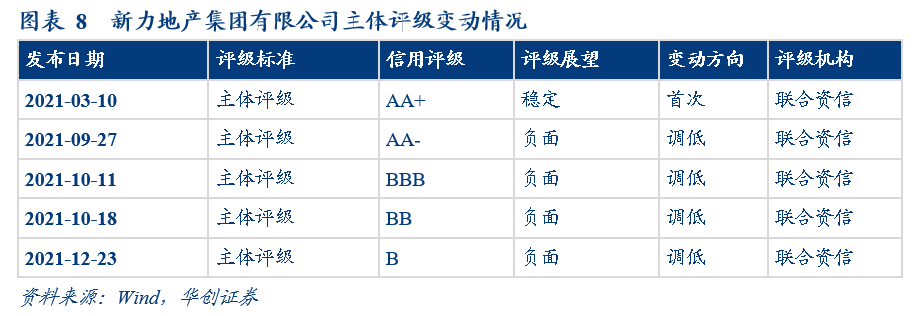 2021年3月10日,聯合資信首次評級新力地產集團有限公司主體信用評級為AA+,評級展望為穩定。2021年9月27日,聯合資信調低公司主體信用評級為AA-,評級展望為負面。2021年10月11日,聯合資信將公司主體信用評級由AA-下調至BBB,評級展望為負面。2021年10月18日,公司主體信用評級由BBB下調至BB,評級展望為負面。2021年12月23日,聯合資信再次將公司主體評級下調,由BB降至B,評級展望為負面。