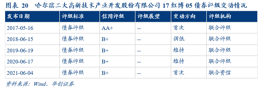 2017年5月16日,聯合評級對哈爾濱工大高新技術產業開發股份有限公司發起的ABS債券首次信用評級為AA+。2018年6月15日,聯合評級將信用評級由AA+下調至B+,此后一直維持在B+的水平。