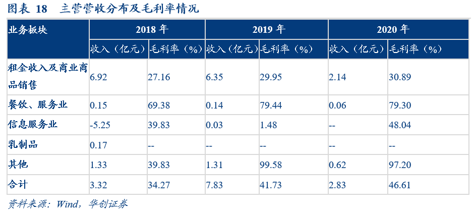 公司原主營業務為大豆深加工、乳製品製造以及商業服務,其中商業服務業務主要為購物中心的物業出租。2020年,租金收入及商業商品銷售收入為2.14億元,佔總收入的75.71%;餐飲、服務業銷售收入0.06億元,佔總收入的2.2%。2018年,信息服務業虧損5.25億元。