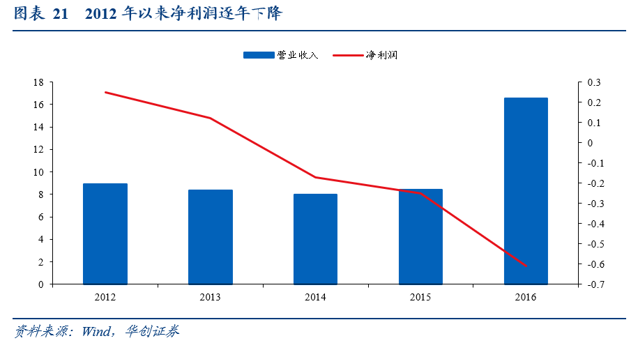 公司盈利能力較弱,2014-2016連續三年淨利潤為負。2016年以公司前主要收入來自於物業出租,2012-2015年營收總額穩定在8億元左右,2013年以前一直處於0.1-0.2億元的微利狀態,2014年及2015年淨利潤連續為負,2016年定增融資24億元收購漢柏科技后,營收增長到16.51億元,但淨利潤仍為-0.61億元,連年虧損導致未分配利潤和庫存現金逐年減少,財務基礎穩固性受損。