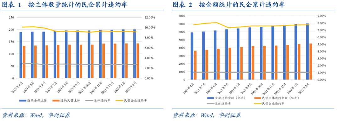 2022年3月違約債券22支,共涉及14家違約主體,與2月相比,3月底按主體總數統計的民企違約率小幅下降,由9.20%變為9.12%;按金額統計的民企違約率小幅下降,由7.64%下降至7.63%。