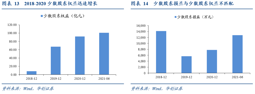 警惕少數股東權益與少數股東損益不匹配的主體。此類主體有粉飾債務嫌疑,可能存在明股實債問題。在此情況下公司有較大規模的或有負債,同時對很多項目的控制權也有所降低,合作方為確保安全將資金限制在項目層面,公司無法用於償債安排,實際資產及流動性水分較大,安全性低。