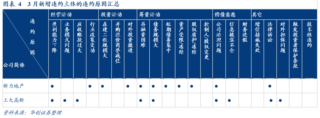根據此前專題《風波初定:114個信用債違約主體因素分析匯總—債券違約覆盤系列之一》,我們使用因素分析法將全部違約主體進行匯總與統計,力求以自下而上的角度,從更客觀的視角分析導致公司違約原因中最為高發的因素。作為對這一統計方法的延續使用,我們將3月新增違約主體及違約后展期主體的違約因素進行了逐一分析,並列入下表中,具體分析見下文。