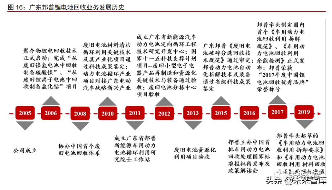 深耕鋰電池回收業務多年。廣東邦普成立於 2005 年,自成立起將鋰電池回收作為核 心業務,建立系統的回收體系和先進的回收處理技術,陸續完成「從廢舊鎳氫電池中回收 製備硫酸鎳」「從廢舊鋰離子電池中回收製備氯化鈷」等項目;不斷發力研發端,成立研 究院士工作站、研究開發中心等;參與制定多項標準,推動行業發展。攜手寧德時代,打 造「電池生產-使用-梯次利用-回收與資源再生」產業閉環。