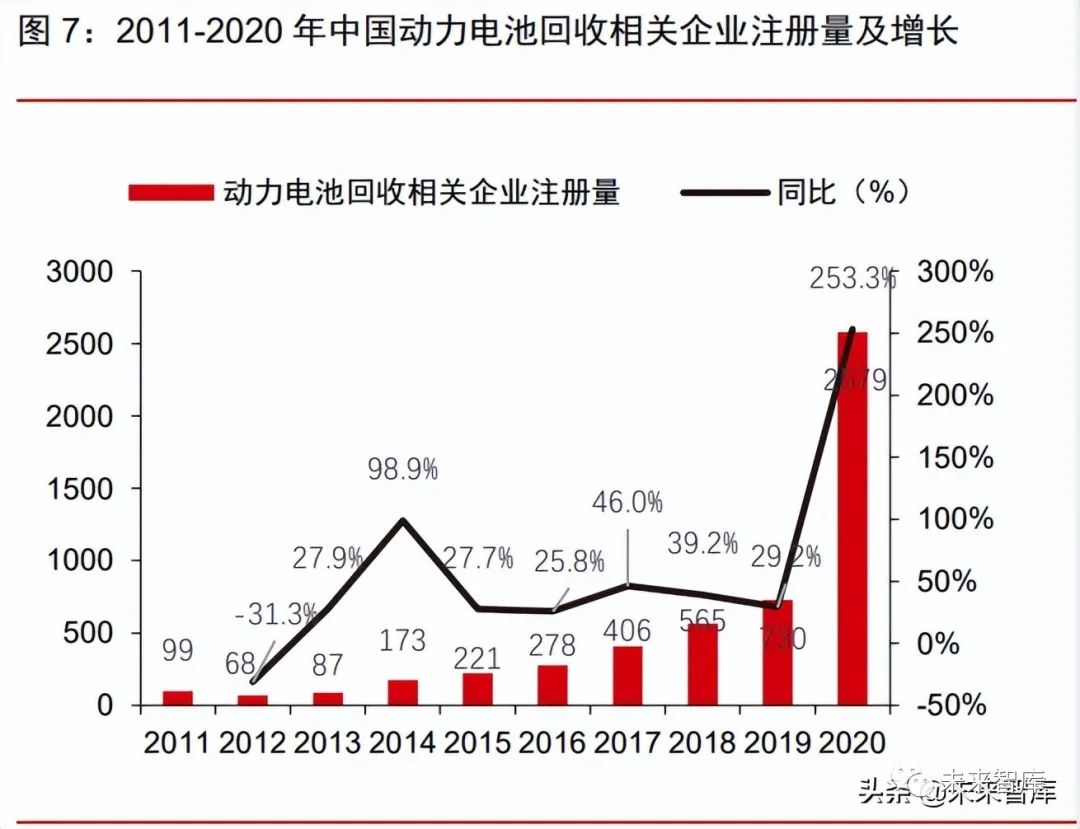 行業空間大吸引眾多企業紛紛入局,具有資質的企業有望增加。在巨大市場空間的吸 引及國家「十四五」循環經濟發展目標等的引領下,眾多企業加速佈局動力電池回收及梯 次利用業務:2020 年動力電池回收企業註冊量為 2579 家,同比高增 253.3%。但目前符 合《新能源汽車廢舊動力蓄電池綜合利用行業規範條件》的企業只有 45 家,未來隨着行 業規範化增強,具有資質的企業數量有望增加。(報告來源:未來智庫)