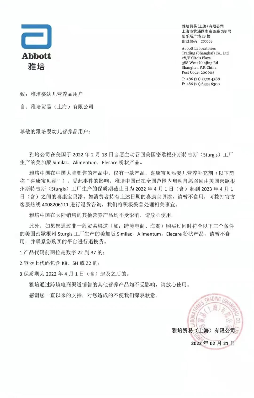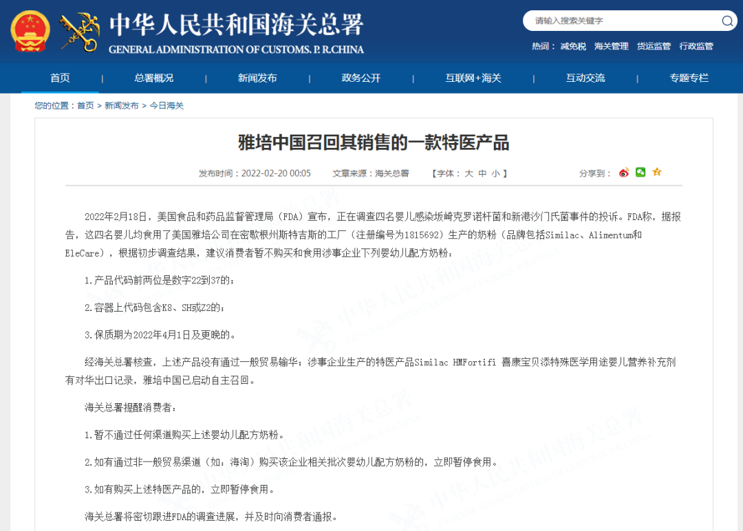 不到48小時,2月20日午夜0點05分,中華人民共和國海關總署在官網發佈「雅培中國召回其銷售的一款特醫產品」,提醒消費者立刻暫停食用雅培「喜康寶貝添」母乳強化劑。