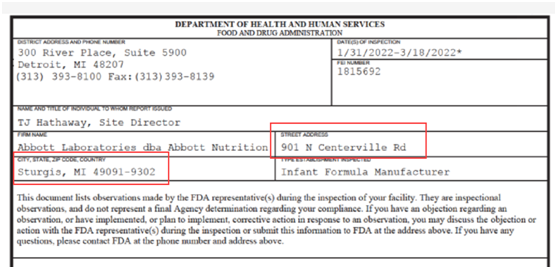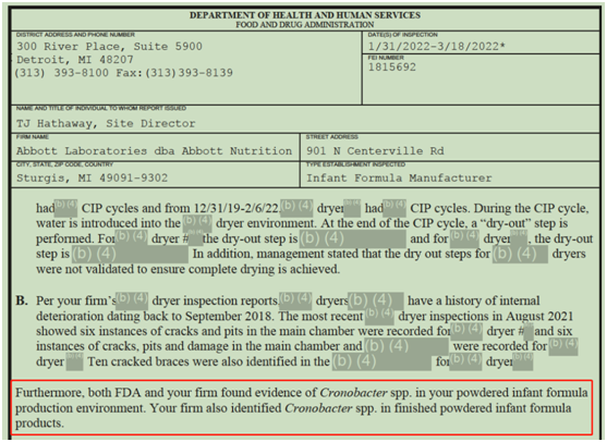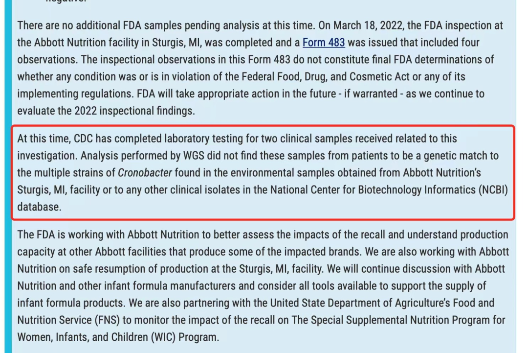 FDA 2月18日披露了對美國雅培工廠的首次調查報告,在審查公司內部記錄時發現,阪崎克羅諾桿菌對雅培工廠環境造成了污染,該公司因存在阪崎克羅諾桿菌而銷燬了產品。