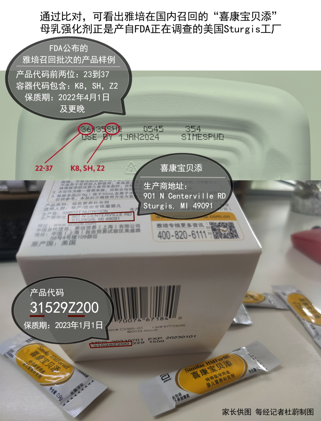 家長向每經記者提供的召回產品外包裝盒上明確寫到,雅培「喜康寶貝添」為美國原裝進口,生產商地址為901 N Centerville RD Sturgis, MI 49091。與FDA調查的Sturgis工廠地址一致。