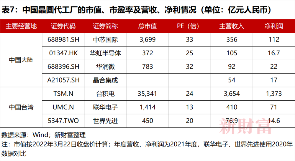 作為全球排名第一的晶圓代工企業,臺積電一騎絕塵,市值超過中芯國際9倍,2020年營收達到人民幣3654億元,淨利潤則高達1373億元。而作為大陸領頭羊的中芯國際,營收、淨利潤均不到臺積電1/10,市值比例則略超1/10(表7)。