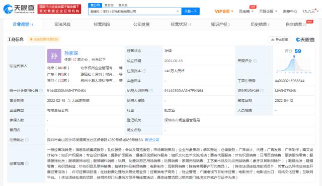 潮貓社(深圳)時尚科技有限公司成立於2022年2月,法定代表人為孫家琛,經營範圍包括服裝服飾零售、批發、出租;玩具、動漫及遊藝用品銷售;電影製作;互聯網銷售等。股權穿透圖顯示,該公司現由深圳大波浪時尚科技有限公司和天津貓眼企業管理諮詢有限公司共同持股,其中,深圳大波浪時尚科技有限公司由沈騰持股52%。