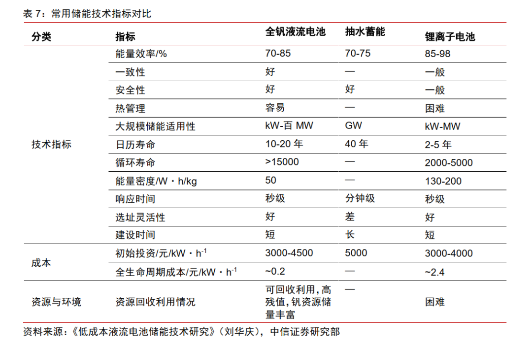 全釩液流電池:安全高效、富有潛力的儲能系統。全釩液流電池因其液流系統能夠保障安全運行,相比於目前儲能主流的鋰離子電池系統更加安全,其使用壽命可達20年,充放電數萬次,生命周期是傳統電池的3-4倍。目前應用的商業化程度最高的導電膜是杜邦的Nafion膜。隨着高功率密度全釩液流電池電堆的開發成功,和新一代全釩液流電池技術的成熟以及產業鏈上游更多企業的參與,全釩液流電池在初始投資成本和系統效率等方面的競爭力將不斷提升。