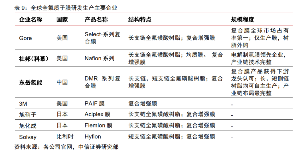 2)市場壁壘:質子交換膜下游應用燃料電池對於膜性能要求很高。質子交換膜屬於燃料電池中的核心部件,膜厚度、化學穩定性、質子傳導率等直接影響着燃料電池的綜合性能,因此對質子交換膜性能有高要求。目前商業中使用最多的仍是杜邦Nafion膜,杜邦公司在質子交換膜行業有領先的技術優勢、先發的市場優勢,處於市場主導地位。后發企業進入需要經過權威認證。東岳集團通過AFCC公司(奔馳-福特質子膜燃料電池電堆研發公司)認證。AFCC擁有專業而嚴格的鑑定程序,對於所有應用於燃料電池汽車的元器件都具有嚴格的規定和要求,按照奔馳和福特新能源汽車的設計指標,對每一個元器件都要通過三個不同階段的技術鑑定,特別對燃料電池膜更有幾十個技術鑑定指標,包括技術、產品生產、專利所有權等都要進行審覈,只有通過這三個階段的鑑定纔有可能被燃料電池汽車產業採用。