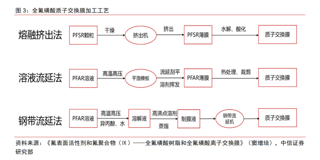 1)原材料單體制備環節:以全氟磺酸質子交換膜為例進行介紹,其原材料為全氟磺酸樹脂(PFAR)。全氟磺酸樹脂由全氟磺酰氟樹脂(PFSR)經過水解轉型后得到,PFAR結構為主鏈側鏈均為氟碳結構,側鏈上帶有磺酸基團。全氟磺酰樹脂由四氟乙烯(TFE)與含有磺酰基團的全氟烷基乙烯基醚(代表化合物全氟(4-甲基-3.6-二氧雜-7-辛烯)磺酰氟,PSVE)共聚得到,其中四氟乙烯為高聚物提供氟碳骨架,提供極強的化學穩定性,全氟烷基乙烯基醚提供磺酸基團,保證質子交換膜的電化學性能。