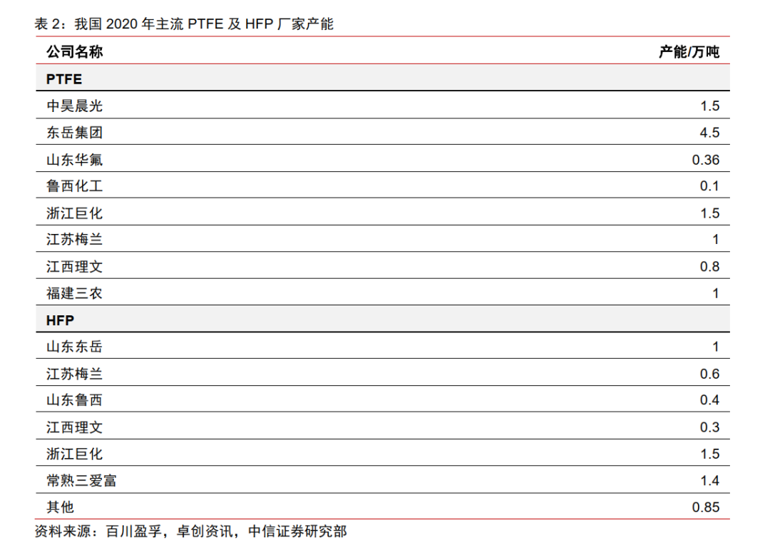PTFE、HFP產能分散,HFP產能逐年增長。據百川盈孚統計,我國PTFE產能目前約為14.96萬噸,其中東岳集團產能為全國第一,為4.5萬噸。2020年HFP產能為6.05萬噸,產能分散,集中度較低。近五年我國PTFE產能與HFP產能基本上呈現逐年增長態勢。上游有機氟化工產能充足,為下游質子交換膜生產提供了充分的保障。
