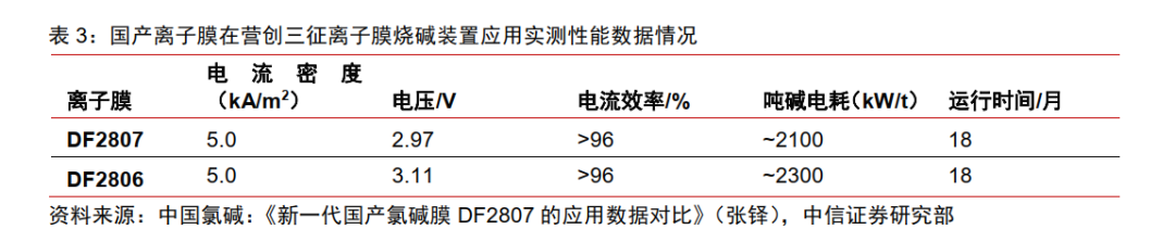國產離子交換膜性能追趕,使用裝置運行穩定。我國經歷長期的研發,國產離子交換膜在綜合性能、性價比上都有所突破,以東岳集團為代表的氯鹼膜應用到國產氯鹼裝置中,長期運行狀態下性能可以與國外離子膜相當。營創三徵精細化工公司有20萬噸離子膜燒鹼產能,國產離子膜DF2806膜與DF2807膜在其電解裝置中進行應用。DF2807膜是國產高電流密度氯鹼膜,帶犧牲纖維,採用自主研發的雙層共擠的成膜工藝,具有更加優異的抗剝離氣泡性能。根據《新一代國產氯鹼膜DF2807的應用數據對比》(張鐸)的數據,截至2019年,DF2807型號離子膜在國內安裝規模接近40萬噸/年。
