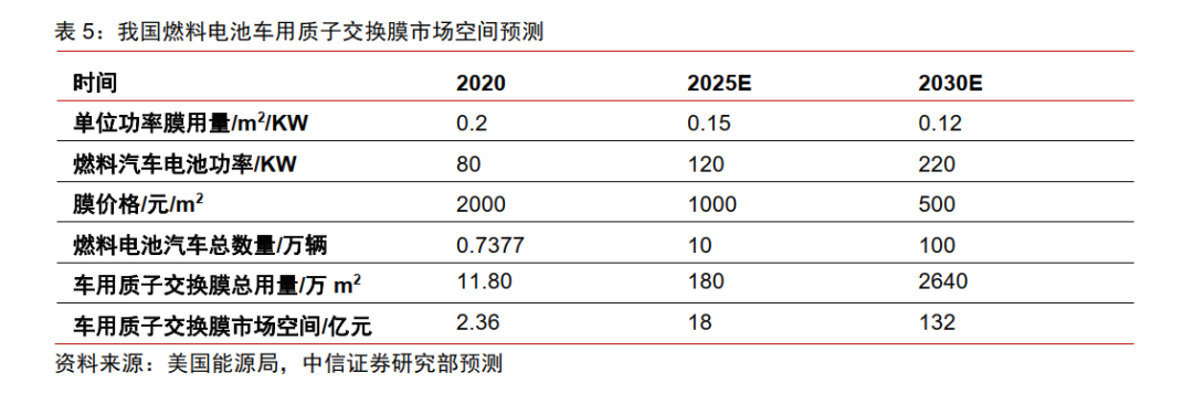 燃料電池質子交換膜市場空間廣闊。我國目前由於燃料電池汽車總體產量規模仍然較小,燃料電池系統成本仍然較高,現階段整車成本仍然高於動力電池汽車和燃油車。隨着生產規模的擴大,燃料電池系統成本將快速下降。質子交換膜作為核心零部件,目前成本約佔燃料電池電堆10-20%,。據美國能源局統計,目前質子交換膜的使用量約為0.1-0.2m2/KW,燃料電池功率不斷提升。目前中國商用車助推的中重型卡車功率大於120KW,49噸牽引車約220KW。隨着我國氫燃料電池汽車產量的提升,國產質子交換膜替換市場空間十分廣闊。