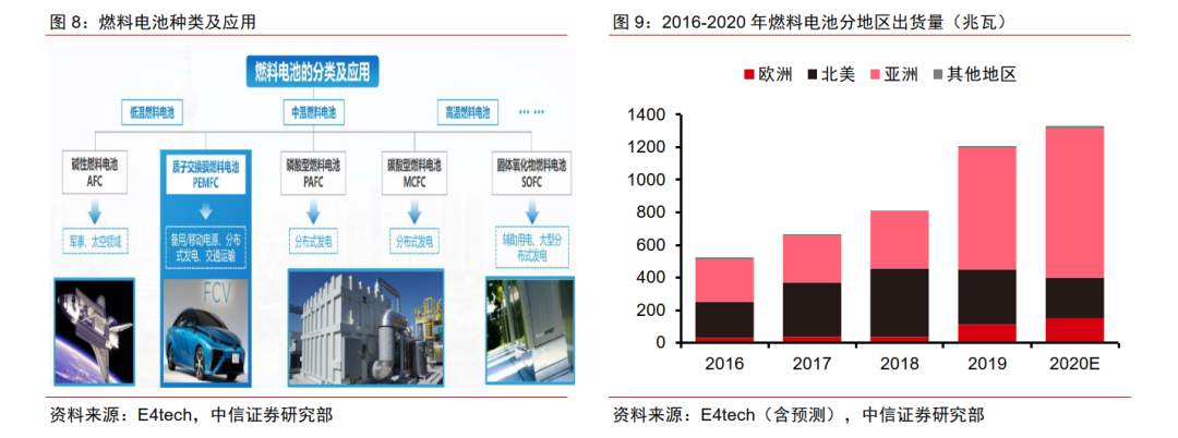 質子交換膜燃料電池(PEMFC)是最為常用的燃料電池形式。燃料電池分為低温燃料電池、中温燃料電池以及高温燃料電池,其中質子交換膜燃料電池屬於中温燃料電池,其具有體積小、工作效率高、啟動迅速、壽命長與電流大等優點。據E4tech統計分析,PEMFC在燃料電池類型的出貨量中佔據主導地位,無論是台套數(目前每年超過44,000台套)還是兆瓦出貨量(目前超過1000MW),過去5年來均保持高速的增長。從世界地區分佈來看,亞洲是燃料電池出貨量最大的區域,大部分燃料電池都裝載於交通運輸工具上。