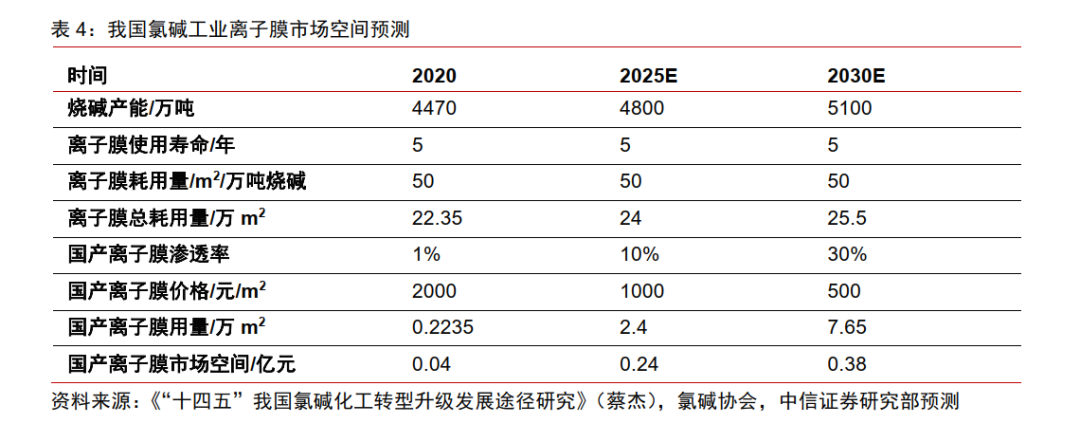 國外離子交換膜長期領跑,國產離子膜替代市場廣闊。我國氯鹼工業所用離子交換膜長期依賴進口,目前國產離子膜的滲透率仍不高。據中國氯鹼工業協會介紹,離子膜國產化以來,國外公司均採取降價等手段保持其離子膜產品在我國市場的主導優勢。2010-2017年,進口膜平均售價下降約25%,影響了相關企業換用國產化離子膜的積極性。我國國產離子膜在綜合性能及價格上仍在積極追趕國外產品,氯鹼行業「十三五」規劃中提出國產化離子膜的行業應用率達到30%的目標,國產離子膜存在廣闊的市場替代空間,我們預計2030年國產離子膜滲透率為30%,國產離子膜市場空間為0.38億元。