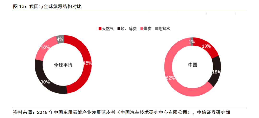 全球主要依賴天然氣等化石能源,可再生能源制氫將改變氫源結構。根據中國氫能標準化技術委員會及《2018年中國車用氫能產業發展藍皮書》(中國汽車技術研究中心有限公司)的統計數據,全球平均氫氣有48%來源於天然氣、30%來自於副產氫、僅18%來源於煤炭。日本由於資源短缺問題,其一直致力於打造一條全球無碳化氫供應鏈,主要依靠基於"可再生能源"發電,利用水電解生產的氫燃料,電解水制氫佔比達到了63%。而中國的氫能源結構仍以煤炭為主,煤制氫佔比62%,天然氣制氫佔19%,而電解水制氫僅佔1%,氫源結構需要優化。《節能與新能源汽車產業技術路線圖》中表示我國將在2030年建設加氫站超過1000座,可再生能源制氫比例達到50%以上,由此我國氫源結構將產生劇烈變革。