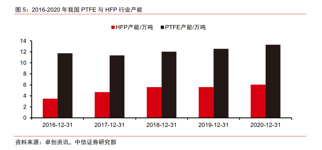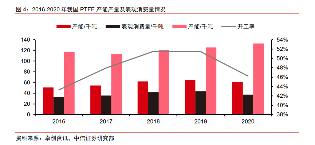 上游有機氟化工產業鏈保障,基礎原料TFE產能充足。我國有機氟化工產業鏈產能有保障,在質子交換膜製備的基礎原料中,四氟乙烯產能充足。四氟乙烯由製冷劑R22生產製得,其主要用於聚合生產聚四氟乙烯(PTFE),熱裂解生產六氟丙烯(HFP)等。HFP是生產質子交換膜的原料之一。根據卓創資訊,PTFE是全球消費量最大的含氟聚合物,產能、產量、需求量均佔全球含氟聚合物的50%以上;我國聚四氟乙烯近年來產量基本維持不變,行業開工率普遍維持在52%以下,產能過剩情況嚴重。PTFE為製冷劑R22下游延伸,為消化R22產能,氟化工企業對PTFE產能進行配套建設,產能過剩較為嚴重,產能出清困難。PTFE目前處於產能過剩階段,這也凸顯出我國四氟乙烯產能充足,為下游分支HFP生產及質子交換膜生產提供了充足的產能保證。